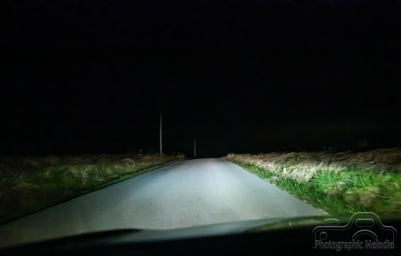 The headlights stab the black air as we travel down the road